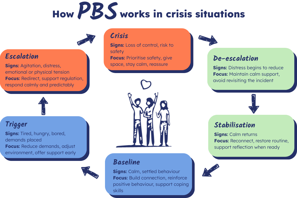 PBS focuses on noticing changes in behaviour, communication, and regulation before the crisis escalates.