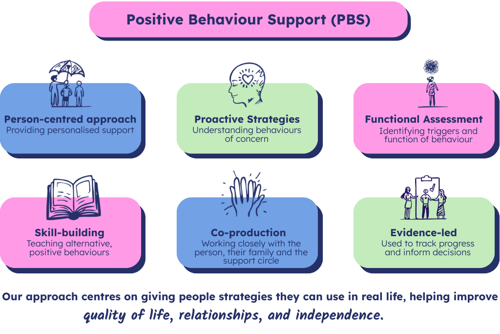 Our team of skilled and experienced PBS practitioners brings years of expertise in health and social care. We work collaboratively, drawing on each team member’s strengths, knowledge, and experience to deliver the best possible support. Our areas of expertise include: